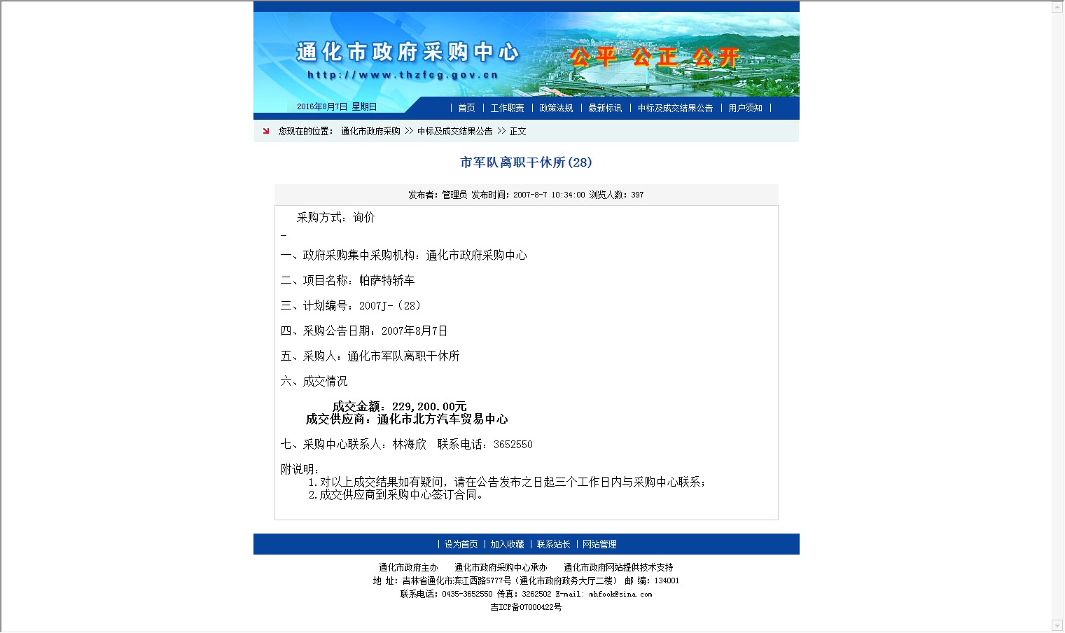 【网站说明】通化市政府采购中心-中标及成交结果公告