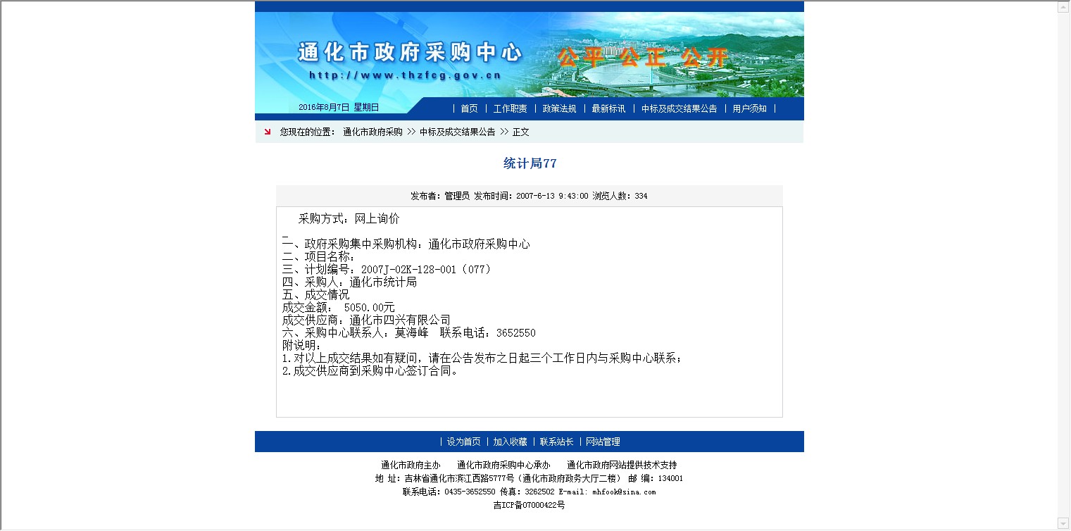 【网站说明】通化市政府采购中心-中标及成交结果公告