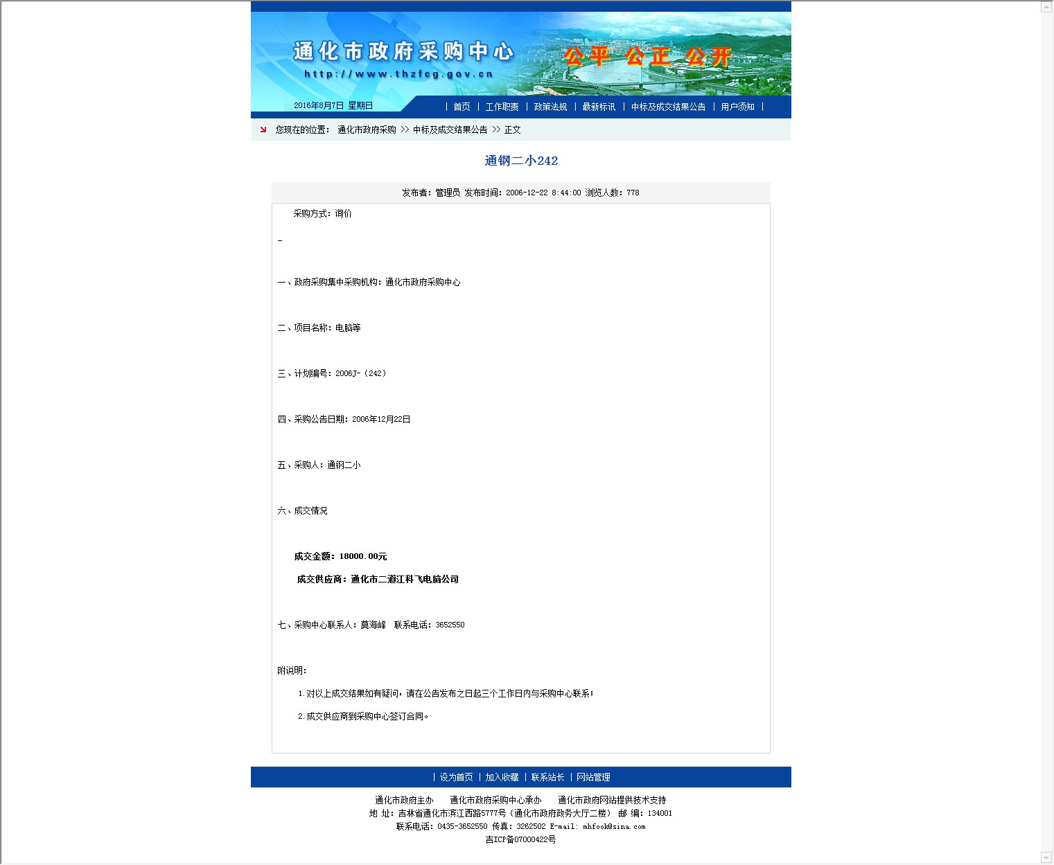 【网站说明】通化市政府采购中心-中标及成交结果公告