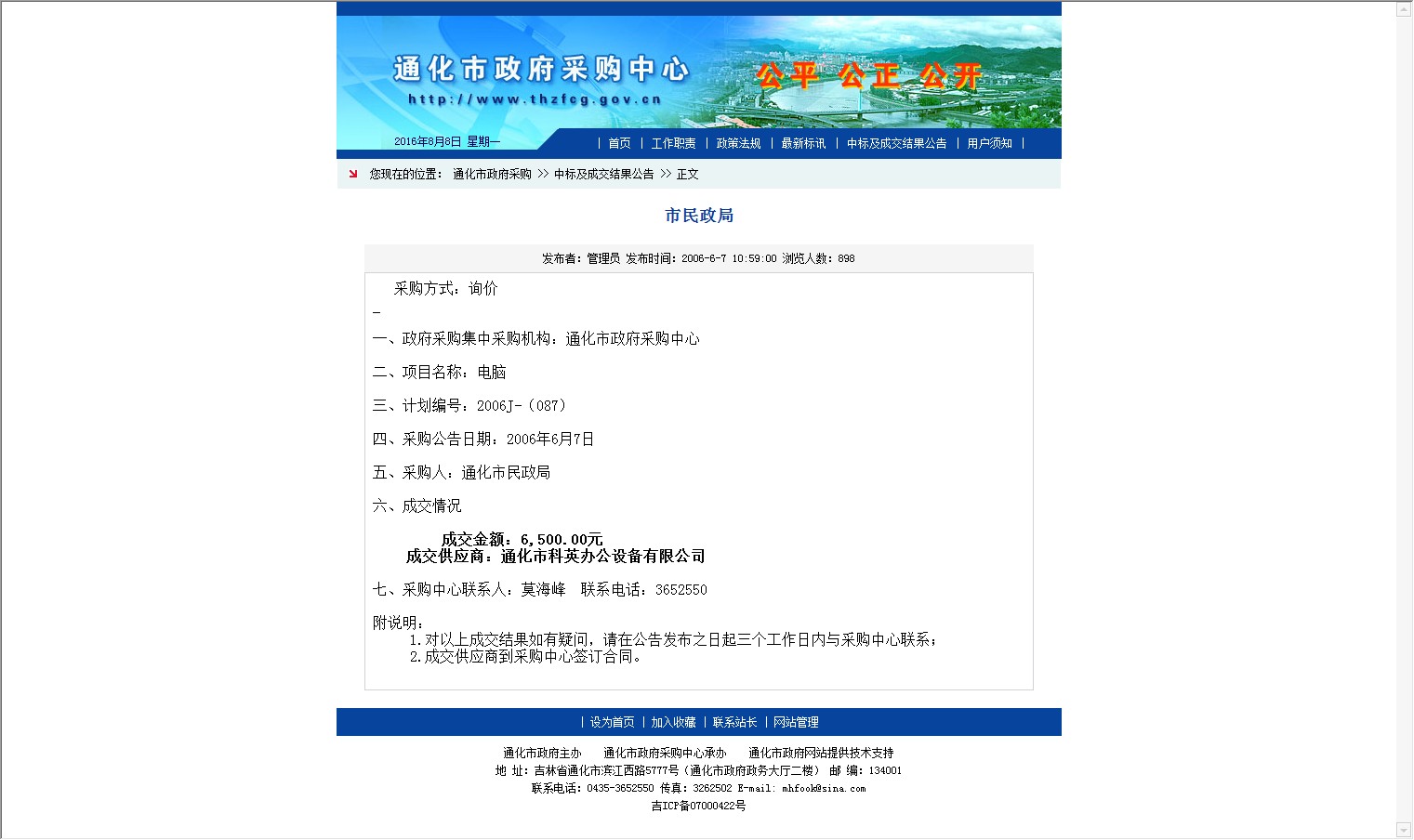 【网站说明】通化市政府采购中心-中标及成交结果公告