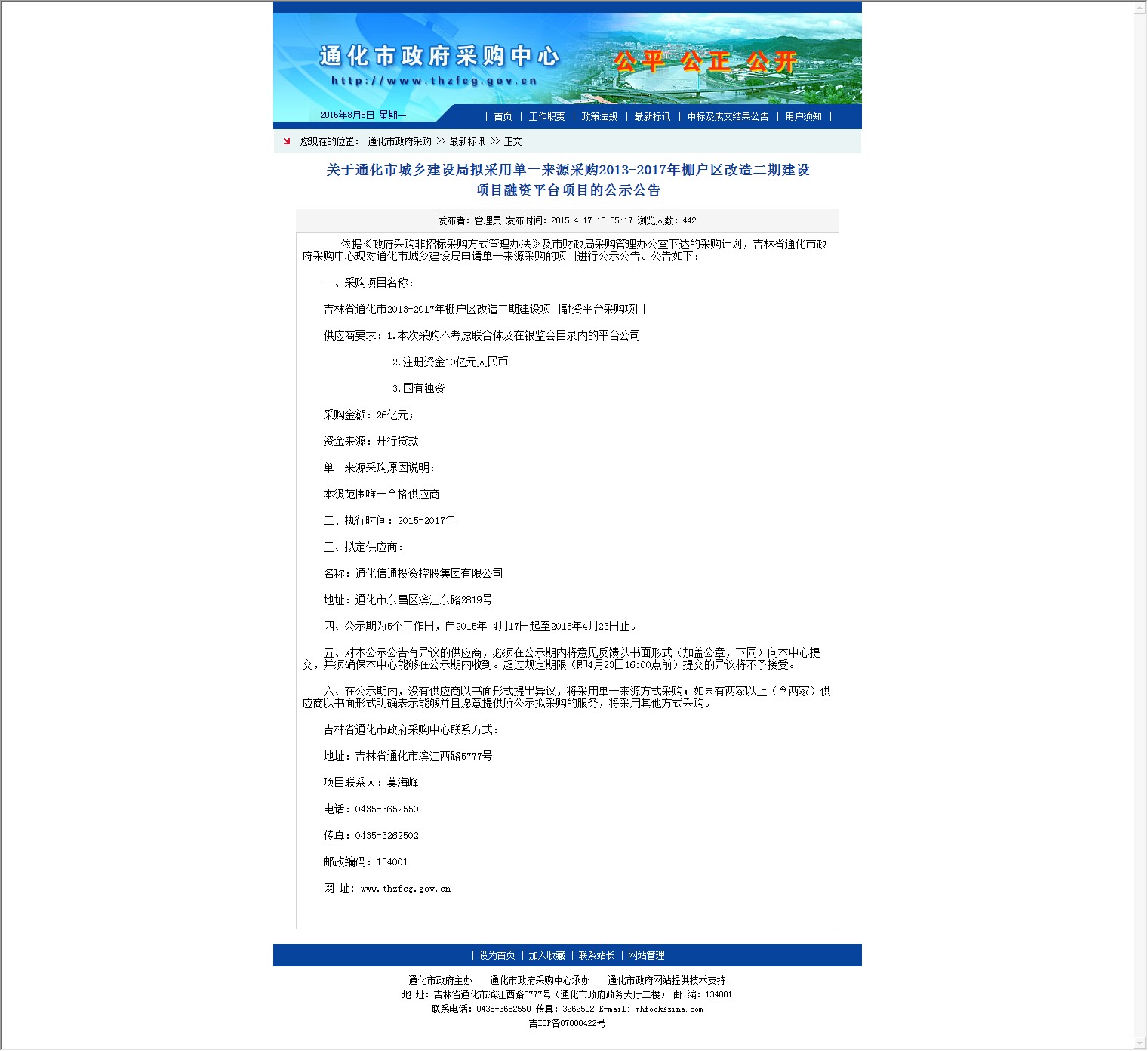 【网站说明】通化市政府采购中心最新标讯