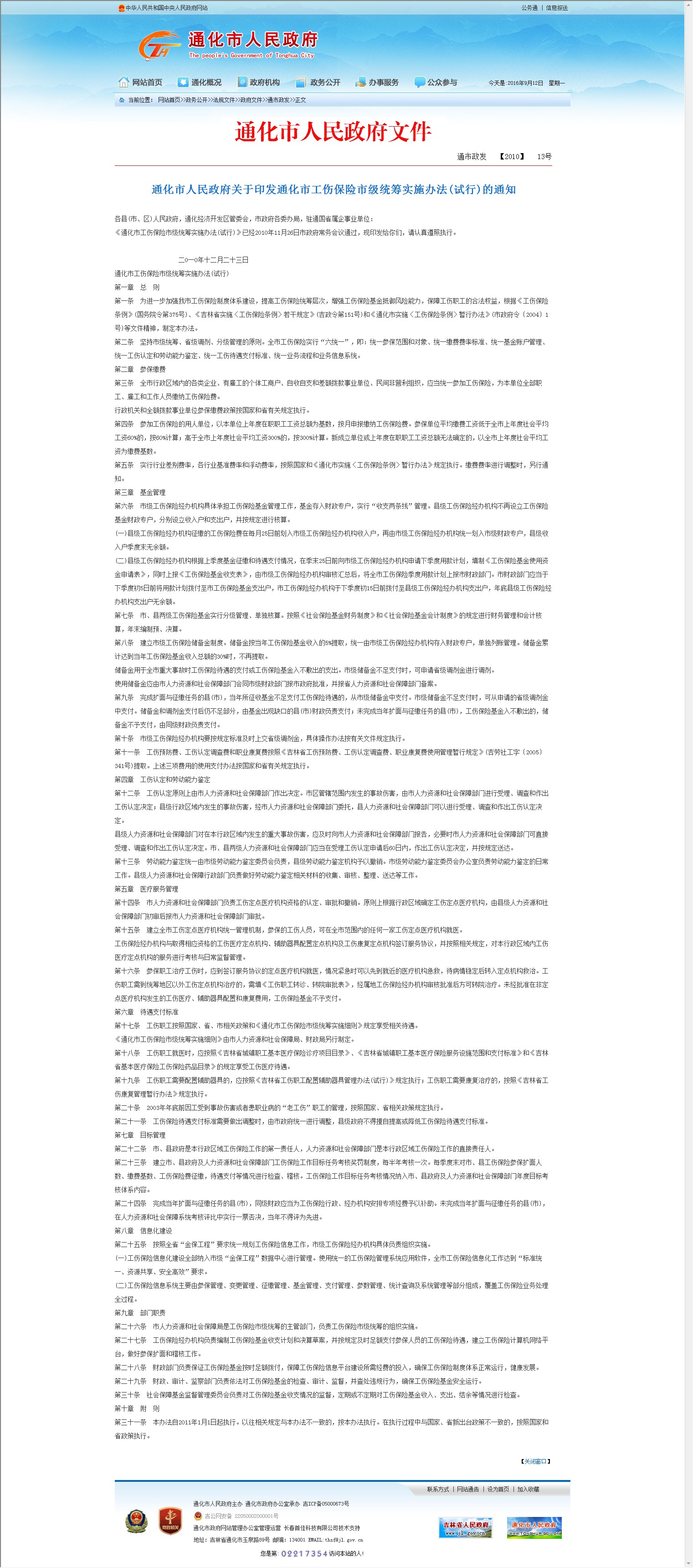 通化市人民政府关于印发通化市工伤保险市级统筹实施办法(试行)的通知