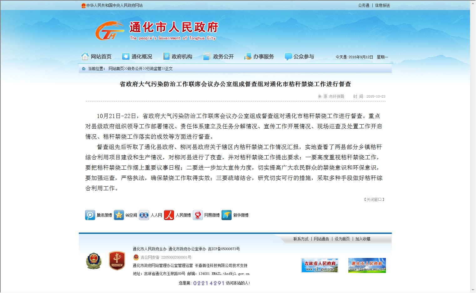 省政府大气污染防治工作联席会议办公室组成督查组对通化市秸秆禁烧工作进行督查