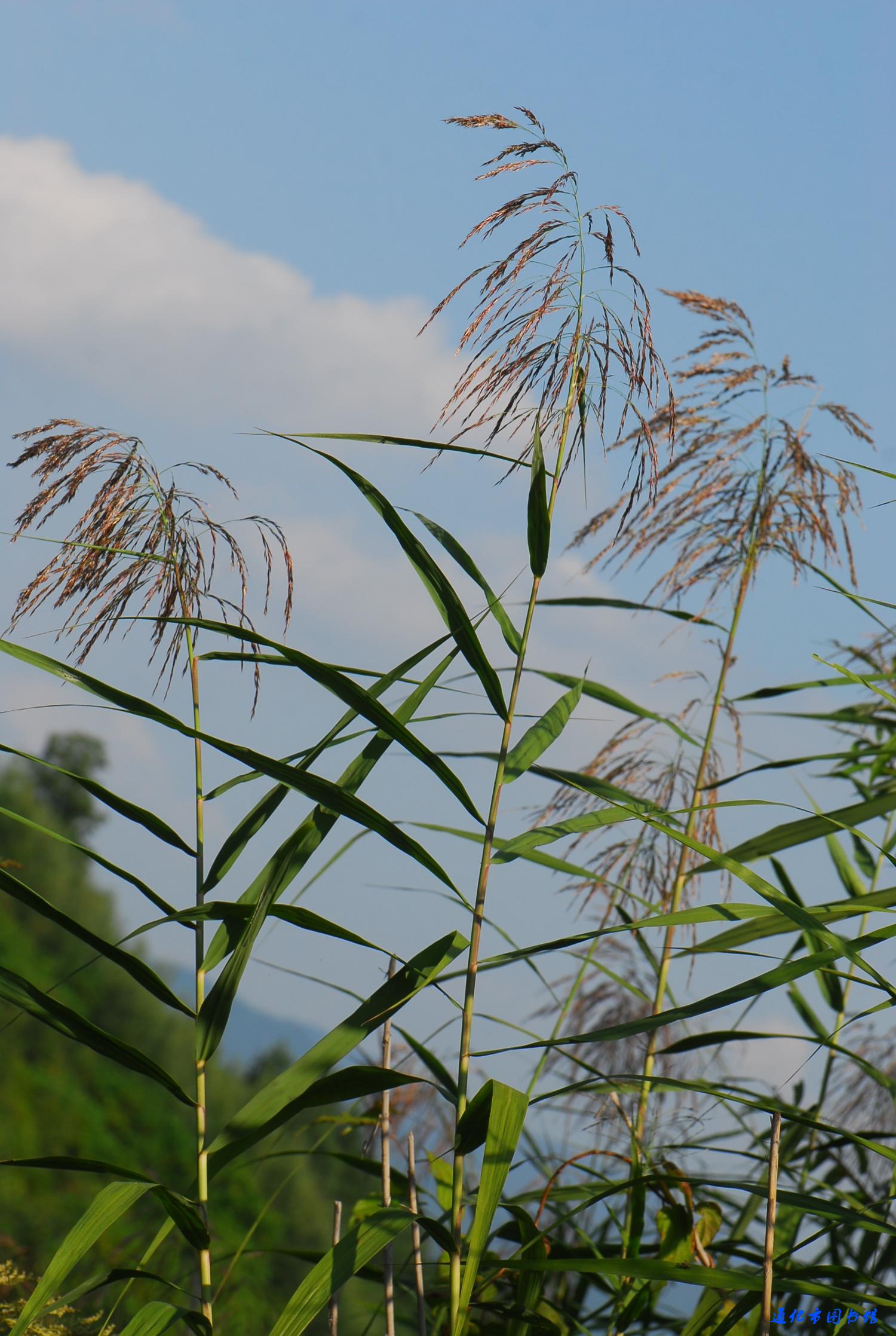 形态特征 多年生草本,高1~3m。地下根状茎粗壮,横走,黄白色,节间中空,节上生须根,节下常有白霜。茎直立,径2~10mm。叶鞘圆筒形,长于节间,无毛或具细毛;叶舌具直立纤毛;叶片扁平,长15~45cm,宽1~3.5cm,光滑或边缘粗糙。圆锥花序长10~40cm,宽2~7cm,微垂头,下部枝腋具长白柔毛;分枝斜上或微伸展;小穗狭披针形,带紫色至污黑紫色,长12~16mm,通常含4~7小花;第一小花常为雄性,颖具3条脉,第一颖长3~7mm,第二颖长5~11mm;内外稃均有3条脉;外稃无毛,长8~15mm,内稃长约3.5mm,脊上粗糙;孕性外稃的基盘具长6~12mm的柔毛。花期7~8月;果期9~10月。