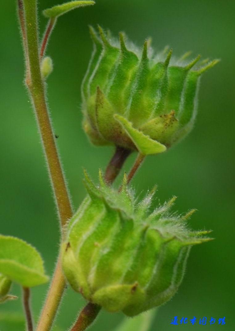 形态特征 一年生草本,高1~2m。茎直立,有柔毛。单叶,互生;柄长2~10cm;叶片圆心形,长3~11.5cm,宽2.5~10cm,先端长尖,基部心形,边缘有疏密不等的圆齿,两面密生星状柔毛。花单生于叶腋或枝端,花梗长1~3cm,密生毛,近端处有节;花萼杯状,5裂,裂片卵圆形,先端尖锐;花瓣5,倒卵形,黄色,较萼长1倍,瓣上有明显的脉纹;雄蕊多数,连合成筒;雌蕊心皮15~20,顶端平截,有毛,排列轮状。蒴果半球形,顶端有扩展,直径2cm,熟后成离果,形似桔子瓣,有粗毛,顶端有2长芒。种子黑色,肾形,有微毛。花期7~8月;果期9~10月。