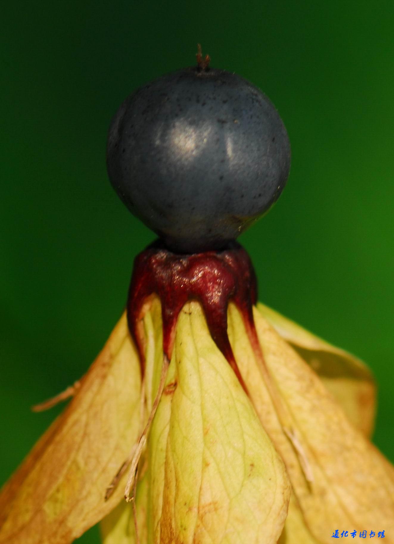 形态特征 多年生直立草本;根状茎细长。植株高20~50cm,茎单一。叶5~8枚轮生于茎顶,叶片倒卵形或倒卵状披针形,长5~15cm ,宽2.5~5cm,先端渐尖,基部楔形,全缘,花梗自叶轮中心抽出, 长5~12cm,顶生1花;外轮花被片4,绿色,叶状,平展,卵状披针形或长圆状披针形,长2~5cm,宽1~2.5cm,先端尖,基部圆形或楔形;内轮花被片4,黄绿色,丝状,下弯,长1~2.5cm,宽约1mm;雄蕊8,花丝扁平条形,长5~7mm,花药条形,长约1cm,黄色,药隔延伸约5~7mm,丝状;子房近扁球形,紫褐色,花柱基部合生。蒴果浆果状,紫黑色,直径约1cm,具数粒种子。花期5~6月;果期8~9月。