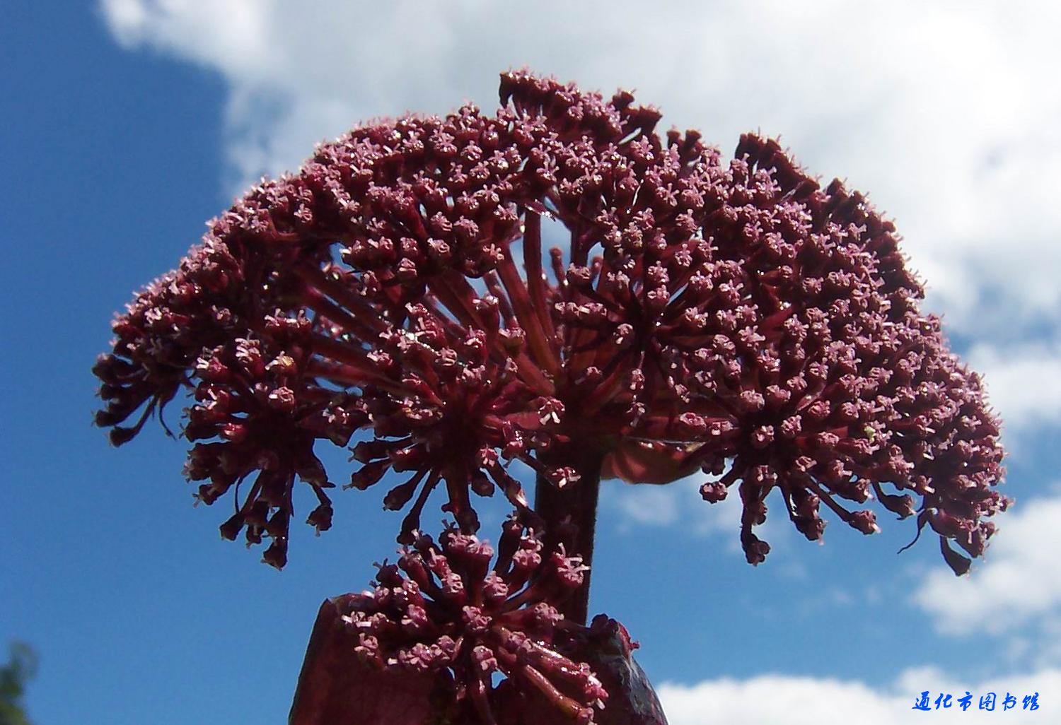 形态特征 多年生大草本,高达2m。根肥大,暗褐色,有粗壮的侧根,具稍辛辣的香气。茎直立,粗壮,带紫色,内部中空。叶柄基部抱茎,叶片特别大,三出状的2~3回羽状分裂、羽状全裂,第一次裂片有柄,宽大,最终叶裂片卵状或倒卵状披针形至长圆状披针形,基部下延成翅状。复伞形花序密,略呈球状,径5~8cm,全部为紫色,总苞片2,大型,膨大为囊状,花蕾时包着花序,伞梗30~70;小伞形花序径约1cm;萼齿不明显,花瓣紫色,卵形、椭圆状披针形,先端渐尖,内卷,雄蕊5,暗紫色,花柱基稍宽扁,肥厚。双悬果椭圆形,幼时紫色,分生果棱槽中各具1条油管。花期7~8月;果期8~9月。