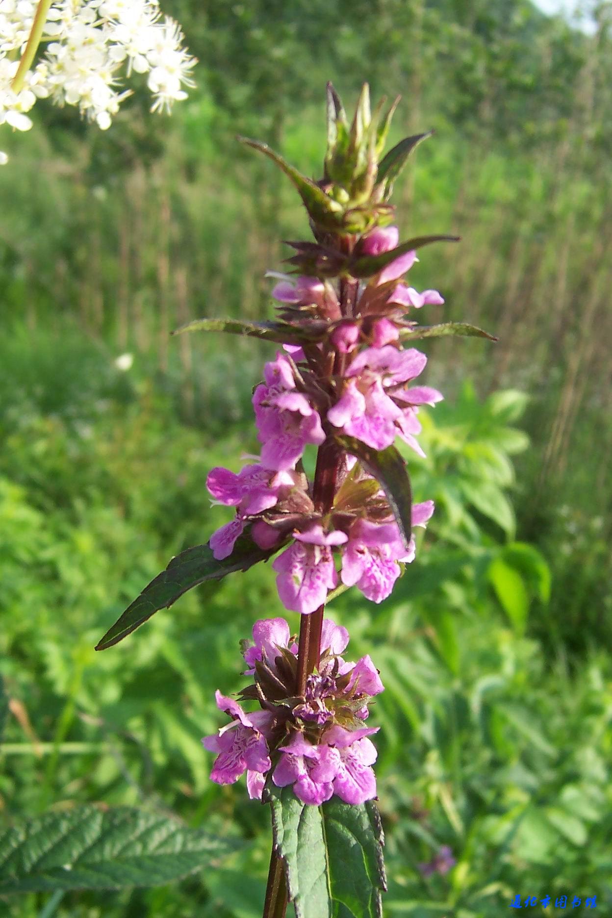 形态特征 多年生草本,高20~80cm。根状茎长,横走,生多数须根。茎直立,单一,四棱形,有槽,棱和节上疏生小刺毛。叶片卵状长圆形,长5~10cm,宽1~2cm,先端微急尖,基部圆形或微心形,边缘具圆齿,上面绿色,下面灰绿色;苞片披针形,无柄,近全缘。轮伞花序每轮6~8花,下部远离,上部密集成长5~15cm穗状花序;小苞片刺状,长约1mm;花萼钟形,具10脉,萼齿5,先端具刺尖;花冠粉红色或淡红紫色,冠筒内具毛环,冠檐二唇形,上唇直立,倒卵圆形,下唇3裂,中裂片大;雄蕊4,均延伸至上唇片之下;花柱先端2浅裂,子房黑褐色,无毛。小坚果卵珠状。花期6~7月;果期7~8月。