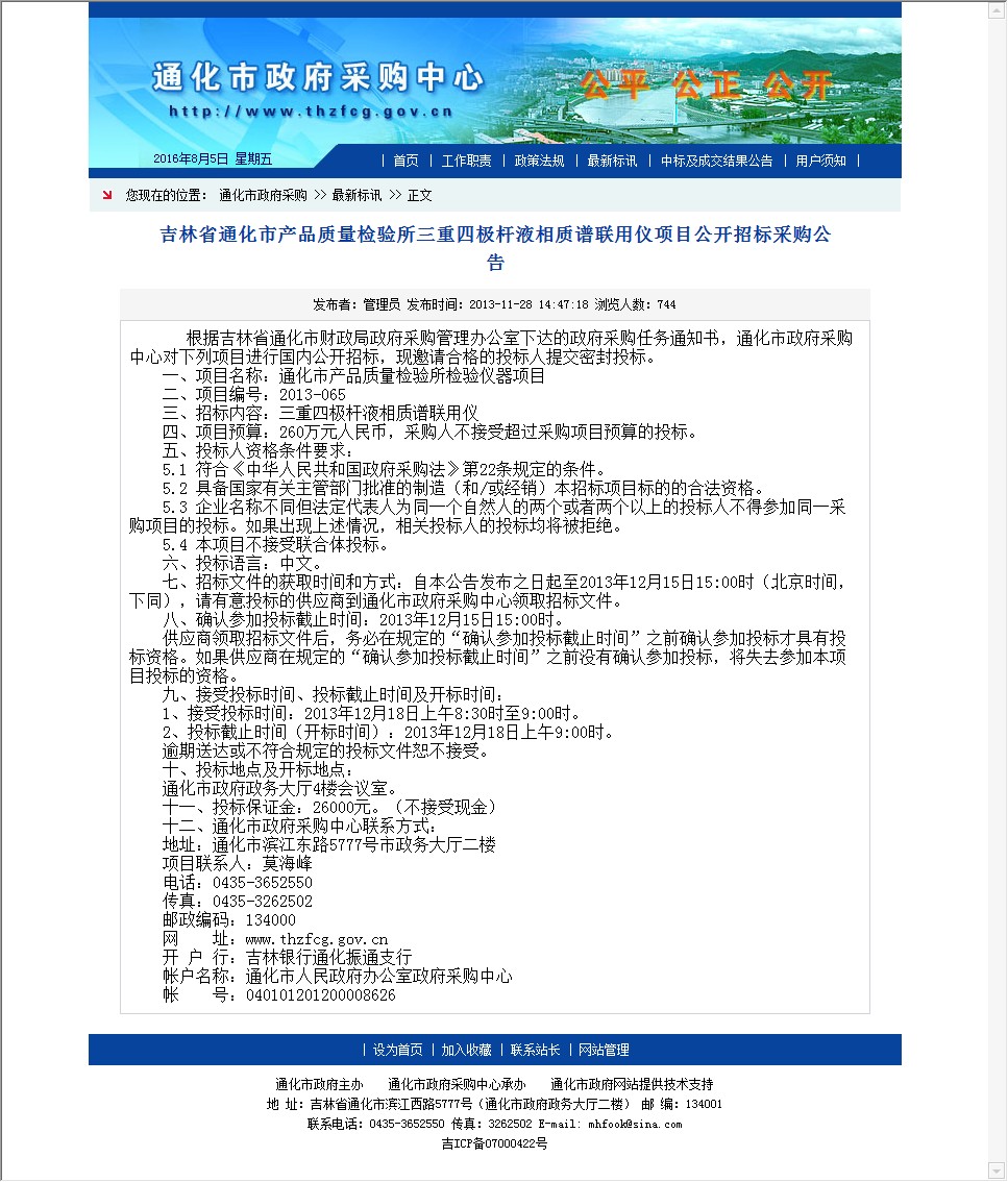吉林省通化市产品质量检验所三重四极杆液相质谱联用仪项目公开招标采购公告