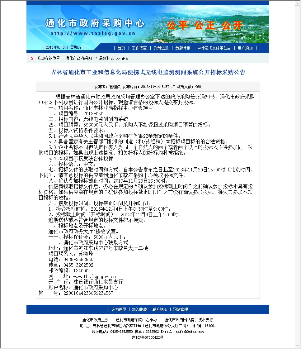 吉林省通化市工业和信息化局便携式无线电监测测向系统公开招标采购公告