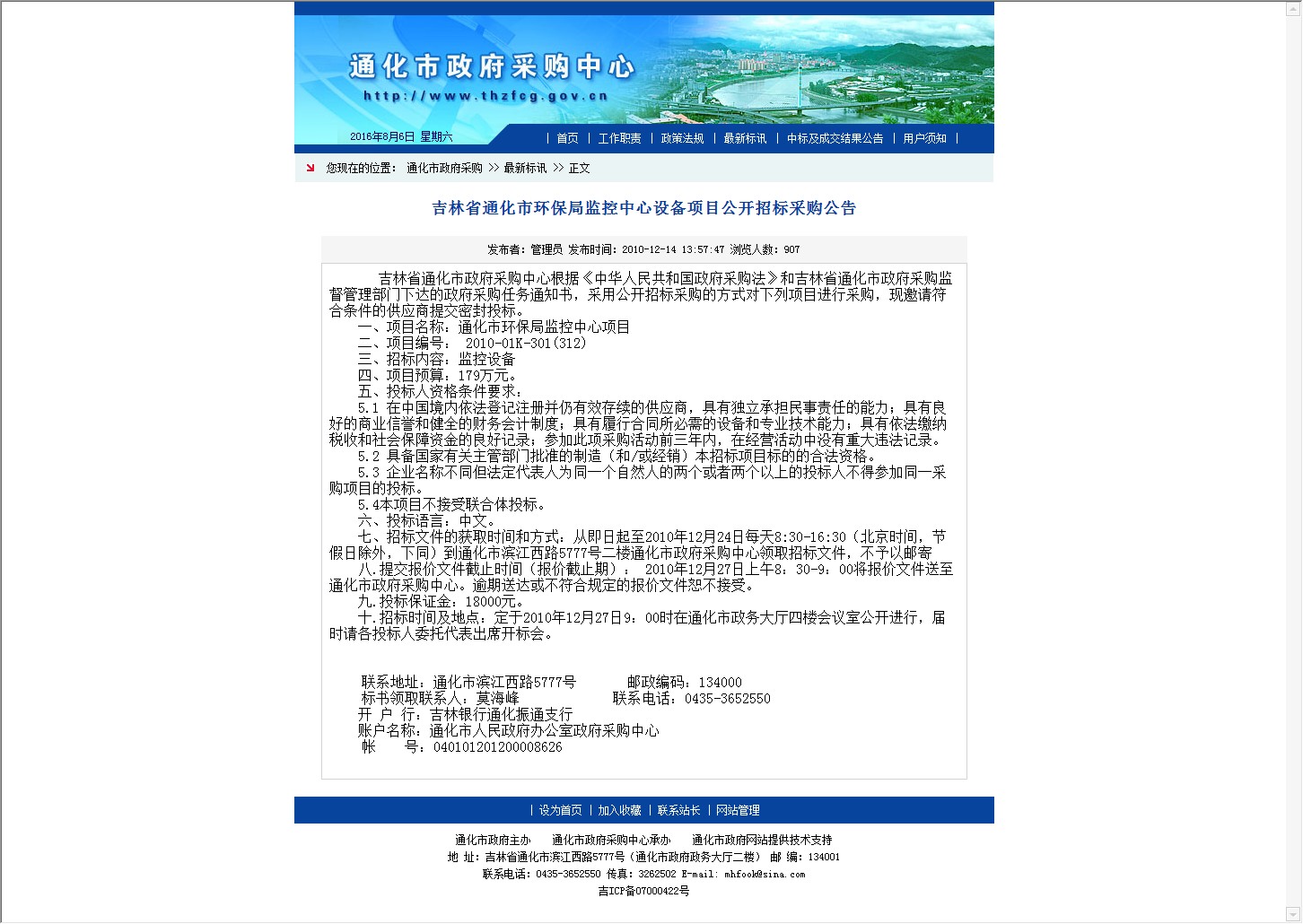 【网站说明】通化市政府采购中心-最新标讯