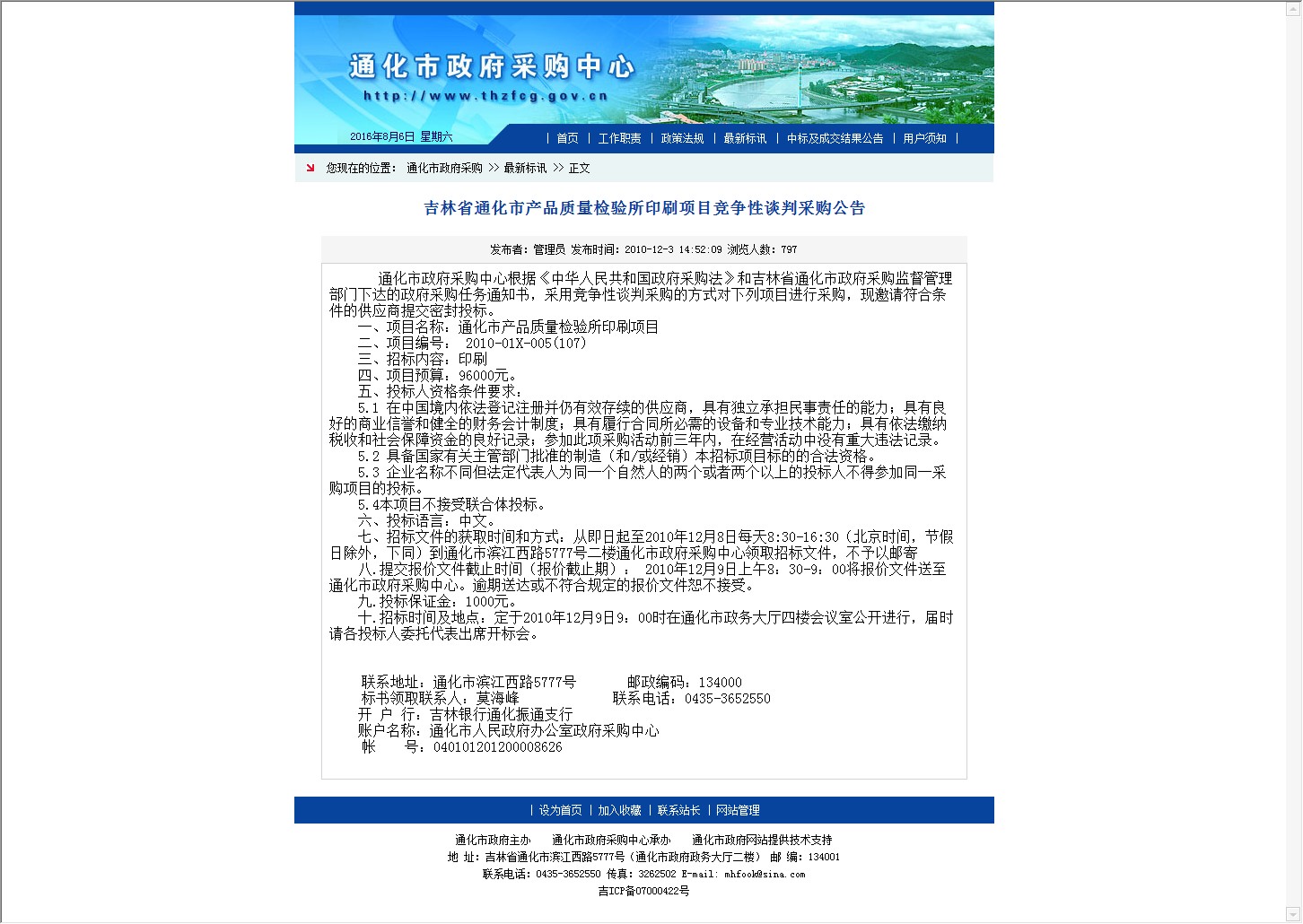 吉林省通化市产品质量检验所印刷项目竞争性谈判采购公告