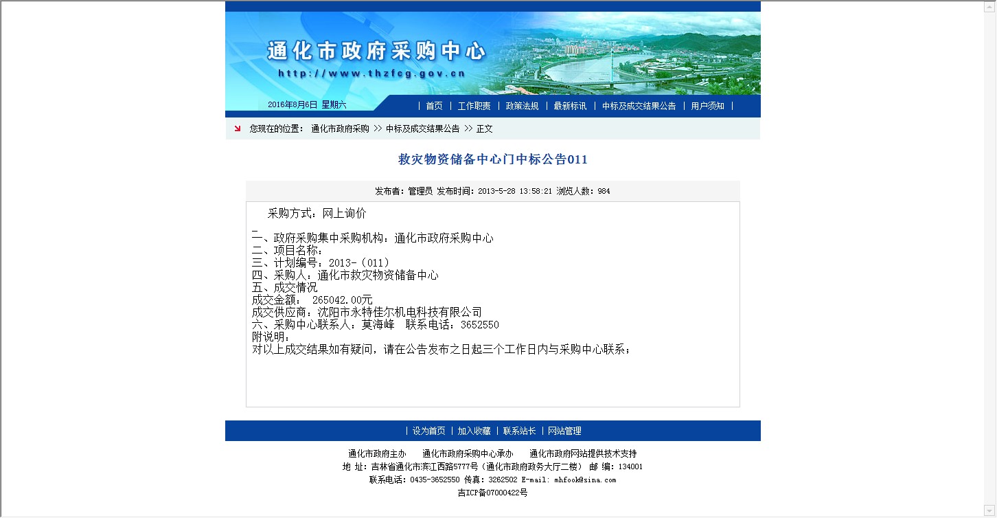 【网站说明】通化市政府采购-中标及成交结果公告