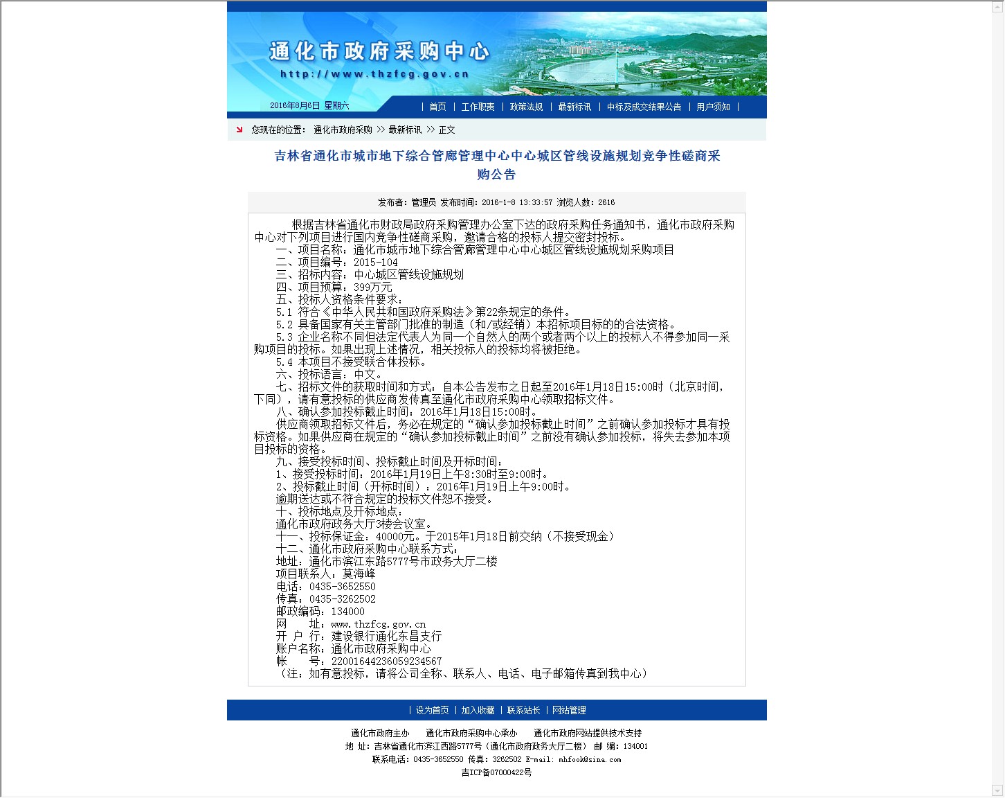 吉林省通化市城市地下综合管廊管理中心中心城区管线设施规划竞争性磋商采购公告