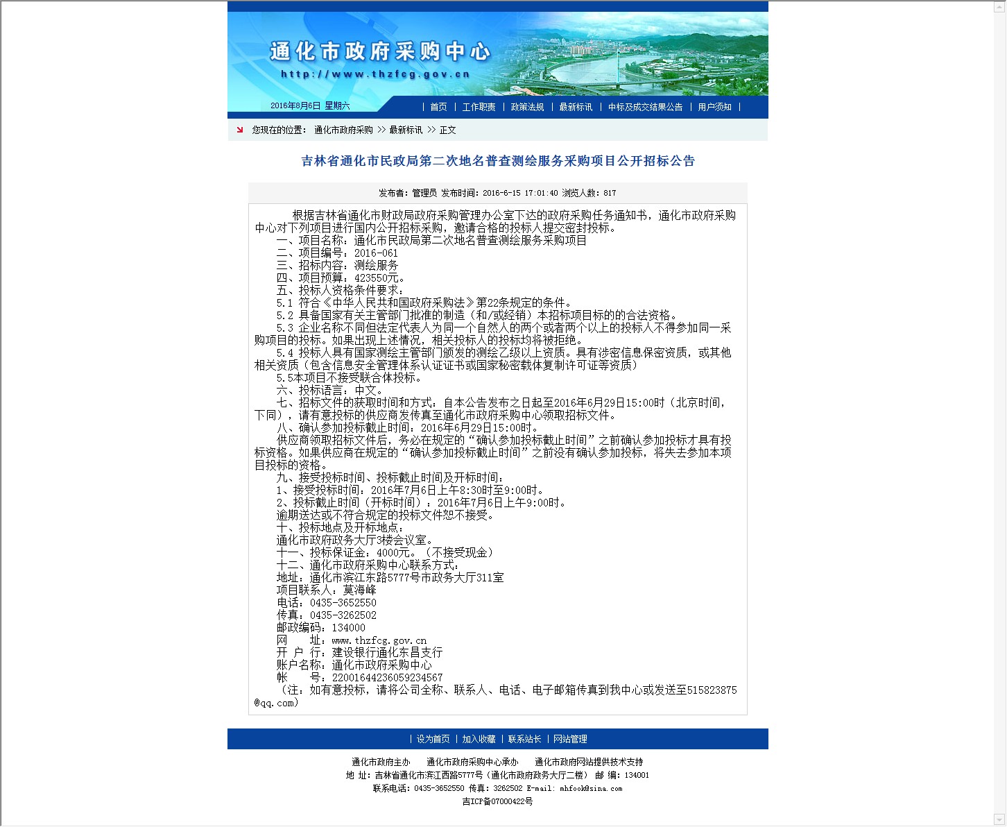 吉林省通化市民政局第二次地名普查测绘服务采购项目公开招标公告